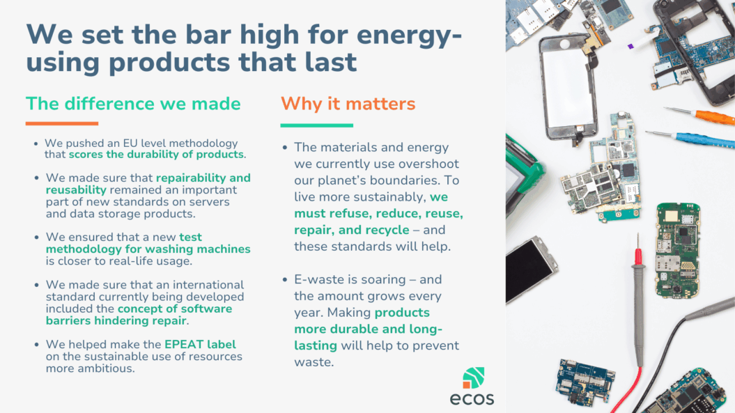 ECOS works to make legal requirements and voluntary commitments on the reliability, repairability, reusability, and remanufacturability of products as ambitious as they can be.