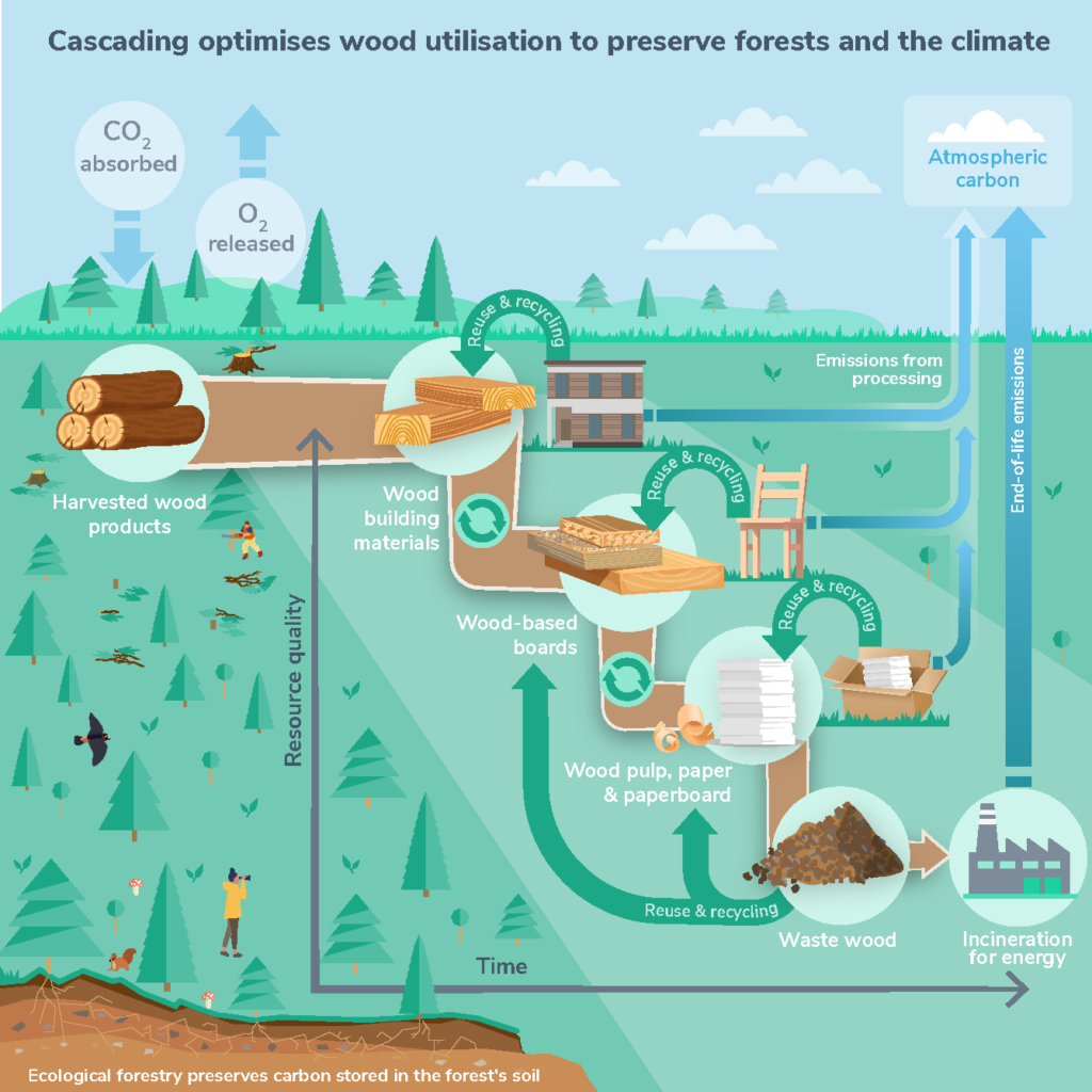 [3] The cascading use principle means prioritising the use of biomass for the highest-value, longest-lasting products first, reusing and recycling it as much as possible, and using it for energy only as a last resort. It ensures limited biomass delivers maximum value while reducing pressure on nature. For more information, see this illustration: https://ecostandard.org/wp-content/uploads/2022/11/ECOS-wood-buildings-1024×1024.png