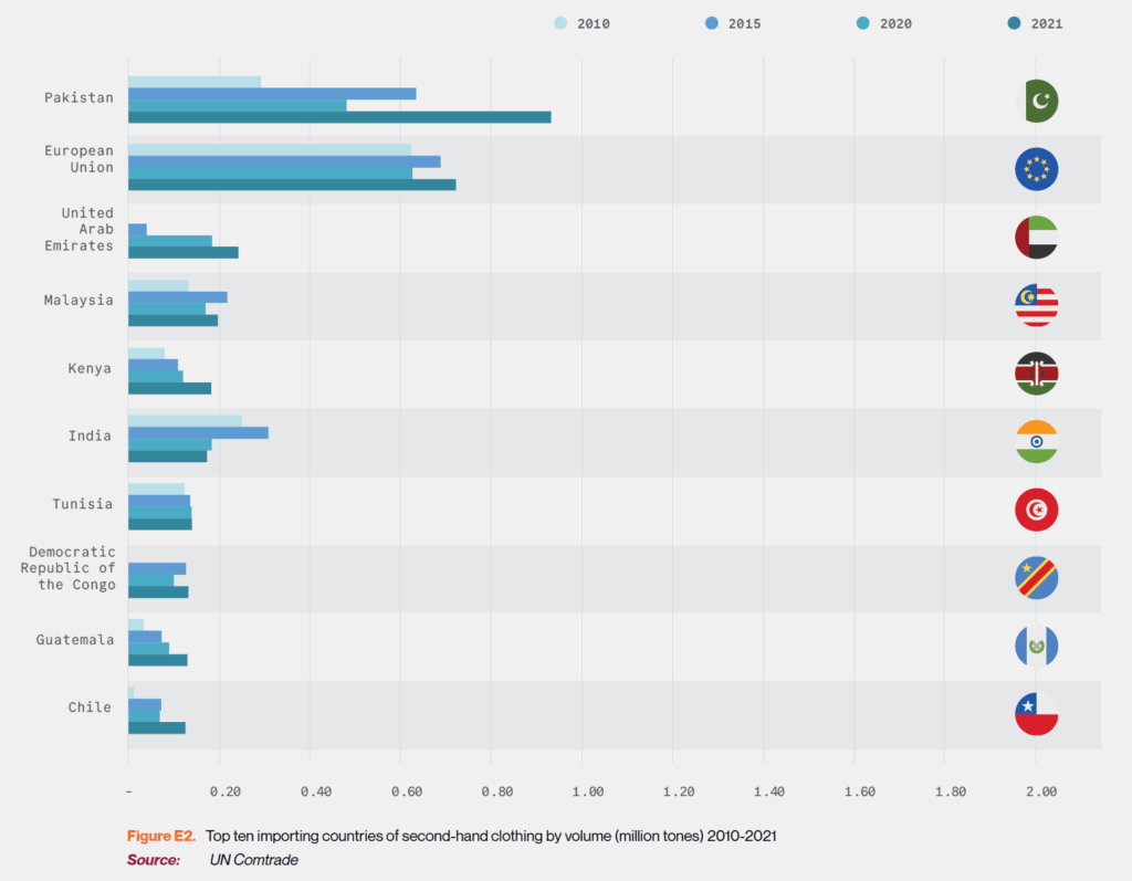 UN figures from 2021 show that the top ten countries/regions importing used clothing are Pakistan, the EU, UAE, Malaysia, Kenya, India, Tunisia, DRC, Guatemala, and Chile.