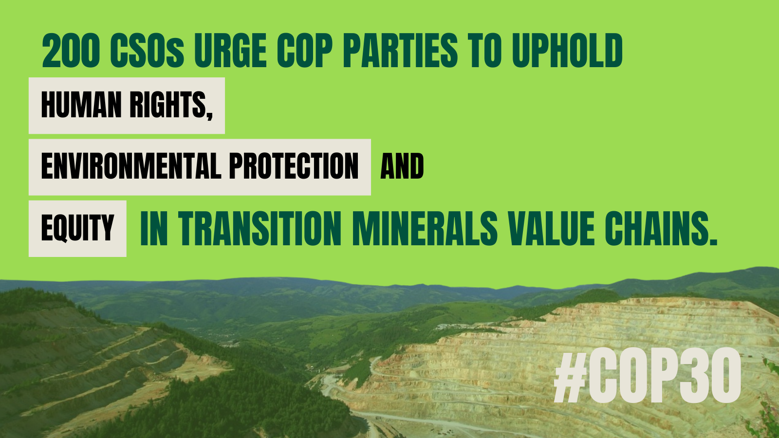 Our collective ability to deliver the Paris Agreement depends on achieving a just energy transition. And yet, the impact of exponential extraction of the minerals underpinning the transition to renewable energy remains a major blind spot in international climate negotiations. As COP30 approaches, we urge Parties to recognise human rights, environmental protection and equity in mineral value chains as central pillars of climate action.